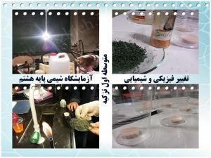 .دانش آموزان پایه هشتم در آزمایشگاه شیمی به بررسی تفاوت های بین تغییر شیمیایی و فیزیکی پرداختند. برای این منظور دانش آموزان چند آزمایش انجام دادند و نشانه های یک تغییر شیمیایی را مشاهده کردند. در ادامه با قرار دادن دماسنج در آب قبل و بعد از آزمایش، دانش آموزان به این نکته پی بردند که حل شدن قرص جوشان بر خلاف تصور گرماگیر است و دمای دماسنج پایین می آید و واکنش مس سولفات با آهن یک تغییر شیمیایی گرماده است.