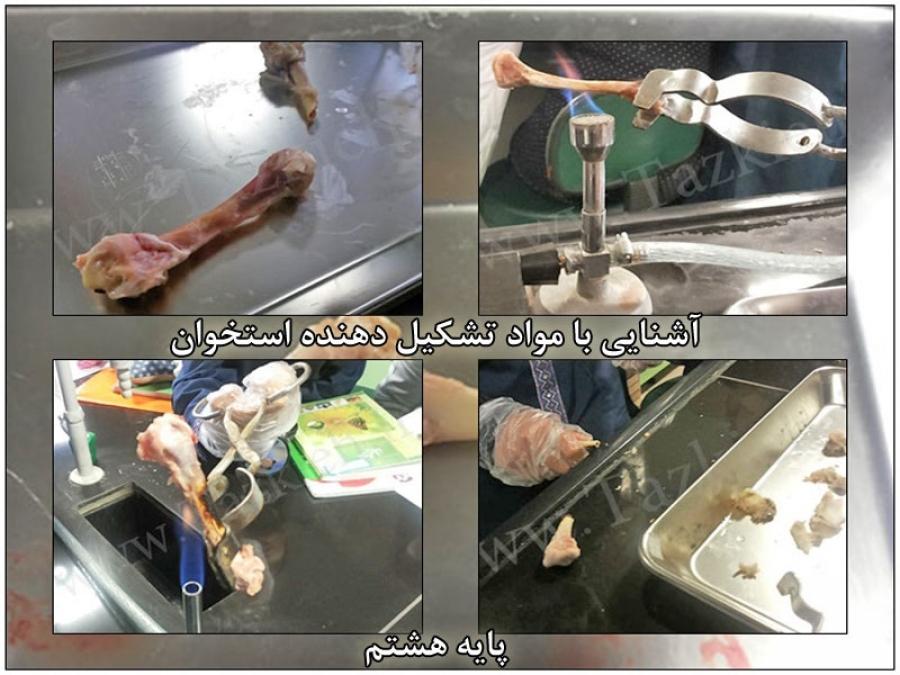 .دانش آموزان پایه هشتم در آزمایشگاه زیست شناسی با نقش مواد آلی و معدنی در استحکام و انعطاف پذیری استخوان آشنا شدند. برای این منظور ابتدا دانش آموزان یکسری از استخوان ها را داخل سرکه قرار دادند تا با از بین رفتن مواد معدنی، نقش این مواد را در استحکام استخوان در برابر فشار مشاهده نمایند. در مرحله بعد با حرارت دادن استخوان ها متوجه شدند که مواد آلی در استحکام استخوان در برابر ضربه نقش دارند.