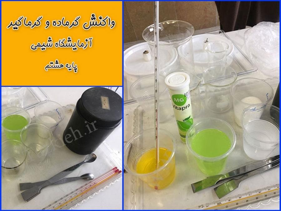 .دانش آموزان پایه هشتم در آزمایشگاه شیمی به بررسی تفاوت بین واکنشهای گرماگیر و گرماده پرداختند. برای این منظور دانش آموزان چند آزمایش انجام دادند و با قرار دادن دماسنج در آب قبل و بعد از آزمایش، به این نکته پی بردند که حل شدن قرص جوشان بر خلاف تصور گرماگیر است و طی آن دمای دماسنج پایین میآید و حل شدن سود سوزآور در آب یک تغییر شیمیایی گرماده است که طی آن دمای دماسنج بالا میرود.