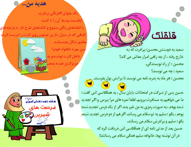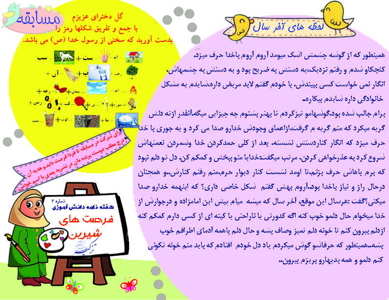 هفته نامه فرصت های شیرین این هفته برای هر دوره به صورت مجزا ودر دو صفحه تنظیم شده است.برندگان مسابقه این هفته نیز می توانند با موضوعات مشخص مطلب ارائه بدهند.