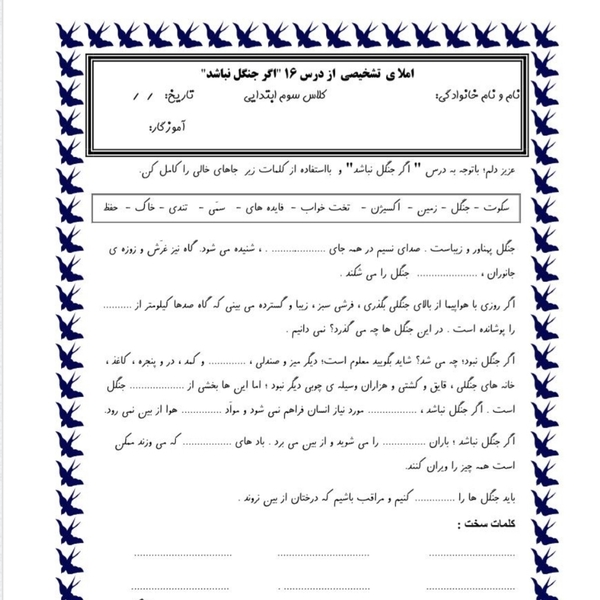 دختران پرتلاش و فهمیده من فیلم را با دقت ببینید و ۴ تا سوال خوب با پاسخ از فیلم اول درآورده و بنویسید.سپس کاربرگ املای درس جنگل رو کامل کنید و کلماتی که به نظرتون از نظر املا مهم هست رو در پایین برگه بنویسید.