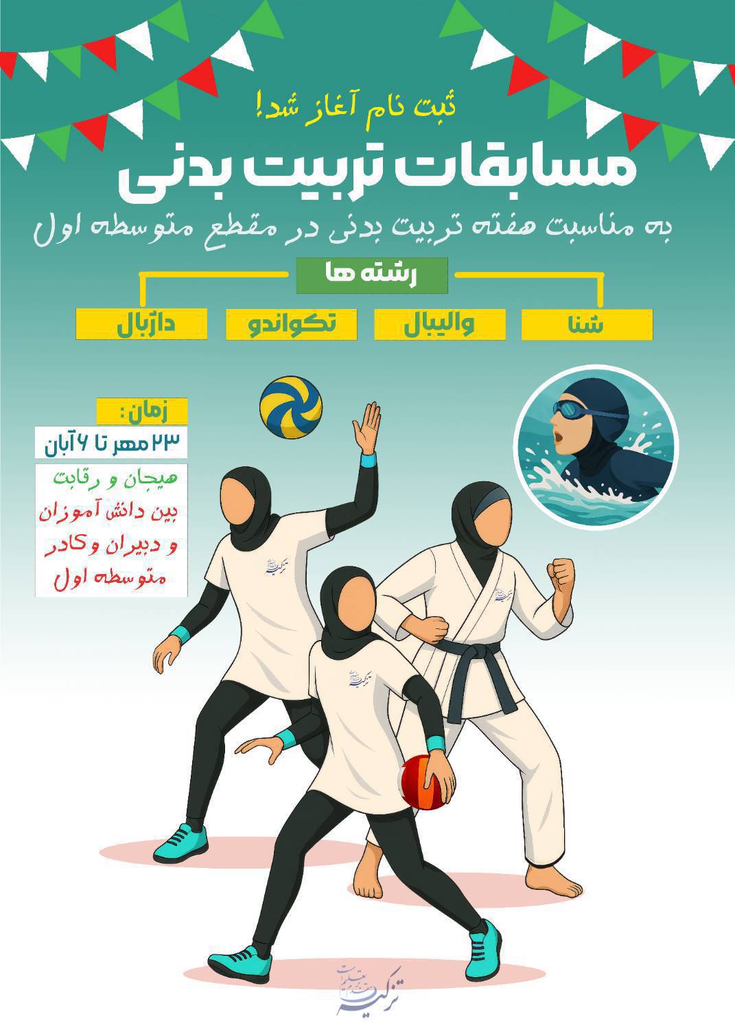 به همت مجموعه ورزشی تزکیه و همزمان با هفته تربیت بدنی ، مسابقات هیجان انگیز تکواندو ، داژبال و والیبال در مقطع متوسطه اول برگزار شد. این رقابت با حضور دانش آموزان و دبیران و کادر بود و با توجه به استقبال دانشآموزان ، دور دوم مسابقات در آبان ماه ادامه خواهد یافت .